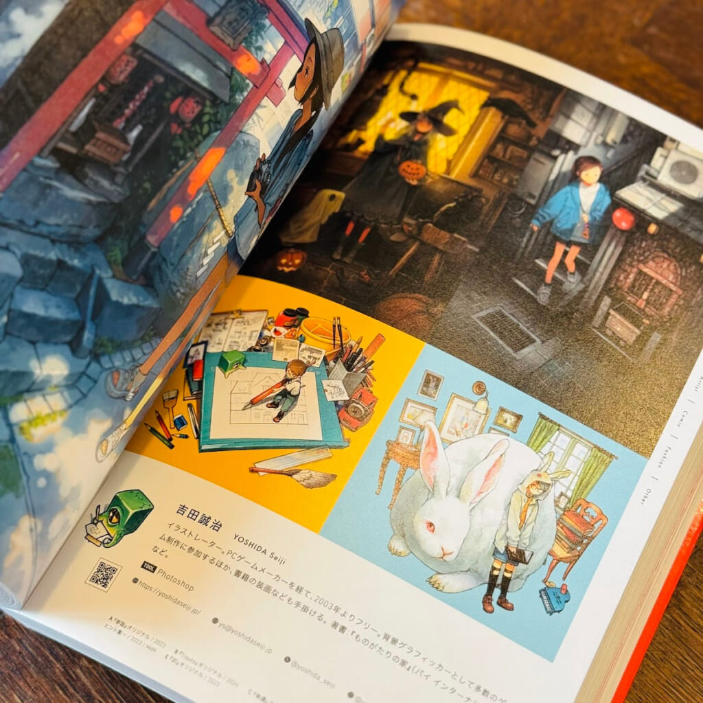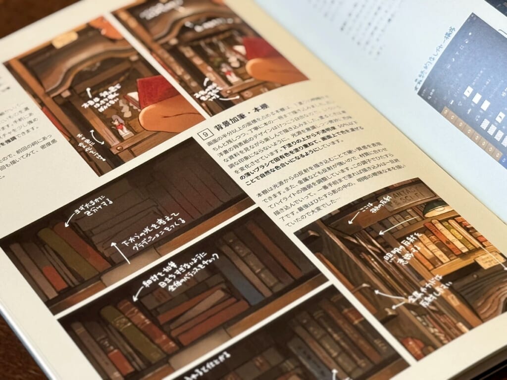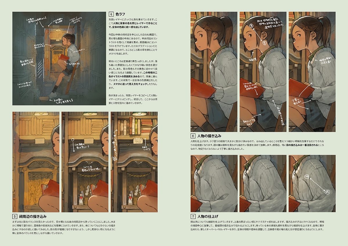 商業や同人でのイラスト作品にくわえて、描き下ろしイラスト3点とそのメイキング、更に50ページにわたって初歩から実践的なパース技術まで解説したテクニック集も収録しています。