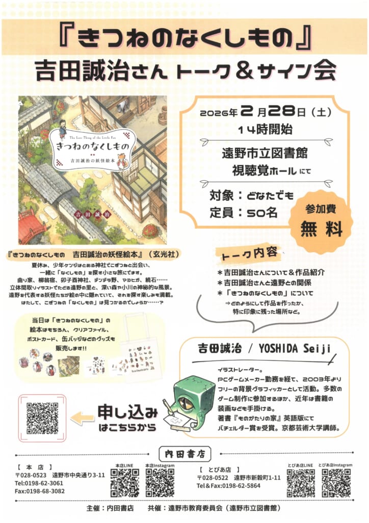 柳田國男『遠野物語』の題材にもなった遠野を舞台に、主人公ケンジとこぎつねが「なくしもの」を探して小さな旅に出る……というお話で、遠野の様々な名所を鳥瞰図風に描いています。