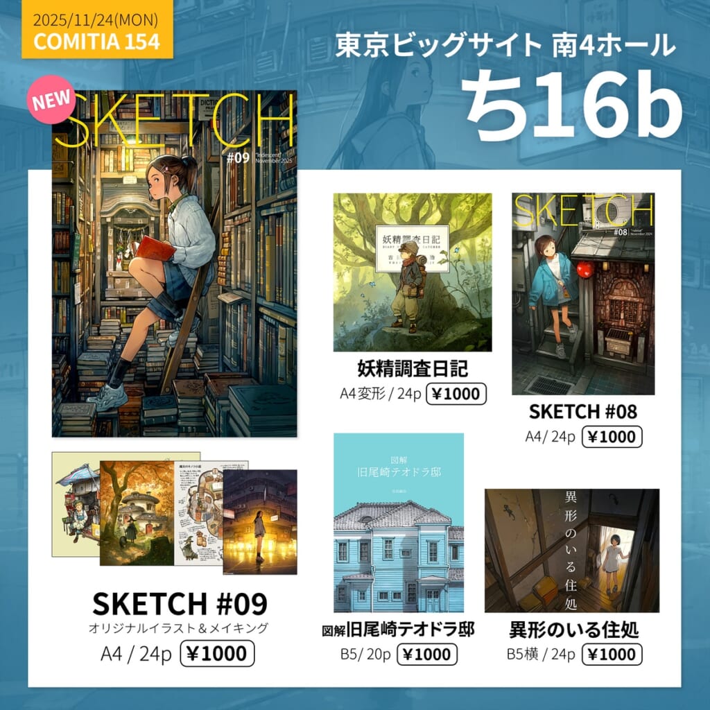 スペースは【南4ホール ち16b】で、新刊「SKETCH #09」は表紙イラストのメイキング等も収録したオリジナルイラスト集になります。